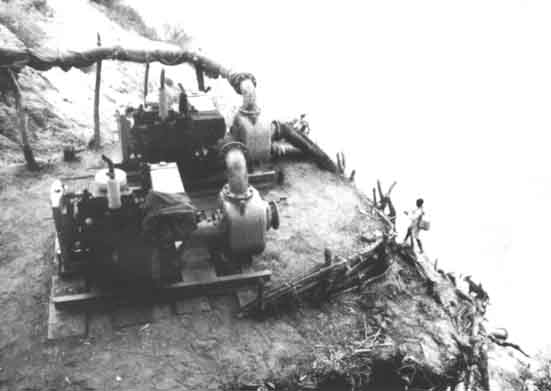 Scheme 3 in Figure 2 is supplied with water which is pumped directly from the river. The cost of pumping water increases with the size of the scheme. The cost of a weir, however, depends largely on the size of the river and only partly on the size of the scheme. Therefore, pumping is often used to irrigate small areas whose sources of water are larger rivers. Also, this may be a much less expensive solution than building a weir. Pumping is essential if irrigation by gravity is not possible. This will be the case when rivers lie well below field level (Figure 8).