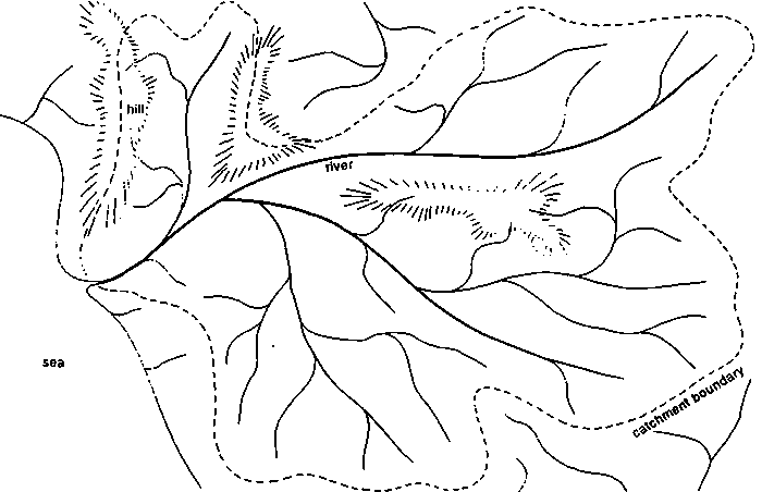 A catchment area is the area from which a particular river or lake receives both surface flow and drainage water originating from precipitation. Figure 3 shows an example of a river catchment area.