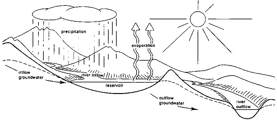 Lakes are supplied with water by rainfall that falls directly on the surface of the lake, by water run-off from the adjacent land and small streams, or by groundwater that seeps through the soil to the lowest point which is the lake. Lakes lose water via evaporation from the lake's surface, via the lake's natural outlet (overflow), or through percolation from the bottom of the lake to the groundwater. The supplies and losses of a lake are shown in Figure 9.