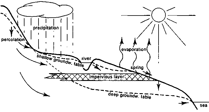 To understand how groundwater functions, think of it as a series of lakes below the surface of the earth. The earth is built up of different layers - sand, gravel, clay, rock, etc. The layers of rock or compact clay cannot store water as they are solid, rather than porous. The layers of coarse sand and gravel, on the other hand, contain many pores and cracks, which allow rainfall to enter the soil and percolate from the surface. These porous layers filled with water are called aquifers. Groundwater flows, in most cases, slowly to the lower parts. Where the aquifer meets the surface, the groundwater flows out of the soil into, for instance, a river or a spring as shown in Figure 14.