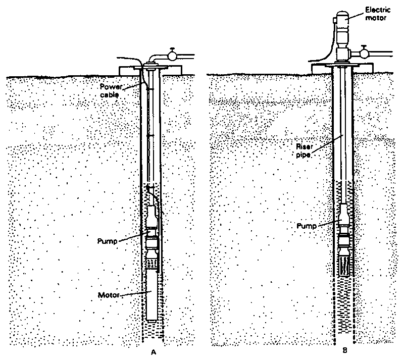 Figure 16 is an illustration of deep wells equipped with submersible pumps. In case A, both pump and motor are submerged, while in case B, only the pump is submerged. The case B pump is driven by an electric motor located at the surface. In both cases, pumped water is pushed up the riser pipe to the surface.