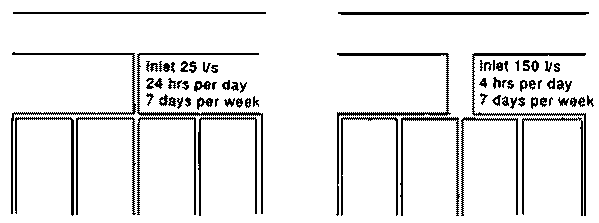 EXAMPLE: What happens if the water requirement of 25 l/s has to be supplied in 8 hours per day and only 4 days per week? In this case, the total amount of time in which the irrigation water has to be supplied is 8/24 or 1/3 of a day during only 4/7 of a week. This leaves farmers with only 1/3 x 4/7, or 4/21 of the time in which to irrigate. During this time the actual flow should be 21/4 times the continuous requirement, or 21/4 x 25, which equals 131 l/s. |