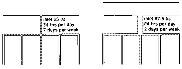 EXAMPLE: Another scheme also has a continuous irrigation need of 25 l/s. Although farmers irrigate the whole day (24 hours), they only do it 2 days a week. Now the amount of time available for irrigation is 2 days out of 7, which is 2/7 or 1/3.5. The supply should therefore be 3.5 times as much during the 2 irrigation days, to supply the same total amount. The actual irrigation flow should therefore be 3.5 x 25, or 87.5 l/s. |