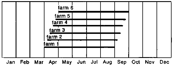 Each line in the diagram represents a farm, or a certain area, and the day it starts onion cultivation. Of course; when crop planting dates are staggered, so also are the end of season dates.