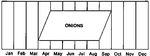 When, for example, the first farmer starts with onion cultivation on 1 April, and other farmers follow more or less regularly on the days after until the last farmer has planted his onions at the end of April, the crop calendar for onions is staggered over one month. In a cropping pattern diagram this staggering is depicted as below.