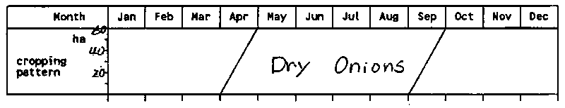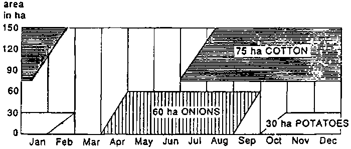 An area which is empty at any given moment in the cropping pattern diagram is not cultivated at that time. For example, during the month of March nothing is being cultivated on the scheme; in mid-September 30 ha of onions have already been harvested and 15 ha of land have been left fallow.