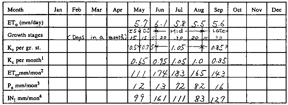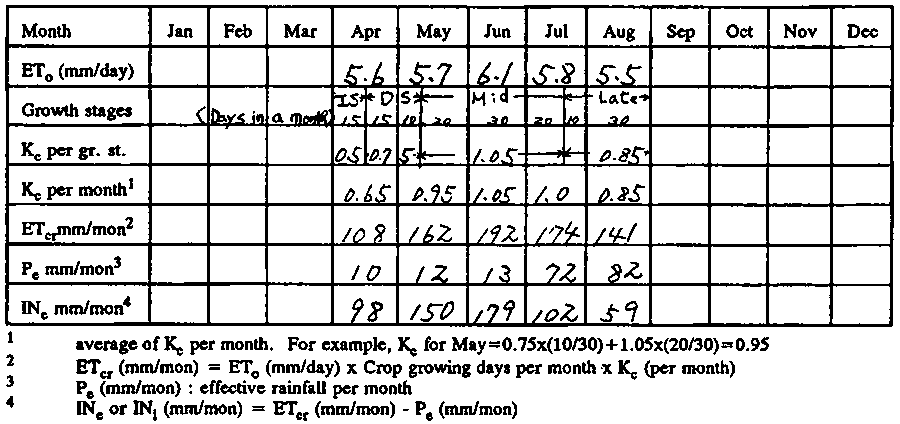 When the monthly irrigation need of an area with staggered crop cultivation must be determined, the irrigation needs of the earliest and of the latest plantings must be calculated. The following example is based on Training Manual 3, Chapter 5, data sheets 3 and 4. Field technicians and extension agents should consult this material before proceeding with this manual.