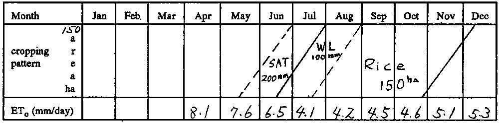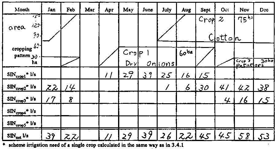In Chapter 3.2 a quick but rough estimation was made of a scheme's irrigation requirement, by using the rule of thumb for the INnet. A much more accurate prediction of a scheme's irrigation flow requirements can be made, if it is based on the scheme's cropping pattern. The cropping pattern, or cropping schedule of an irrigation area provides information, for a period of at least one season, on three important elements: