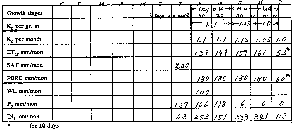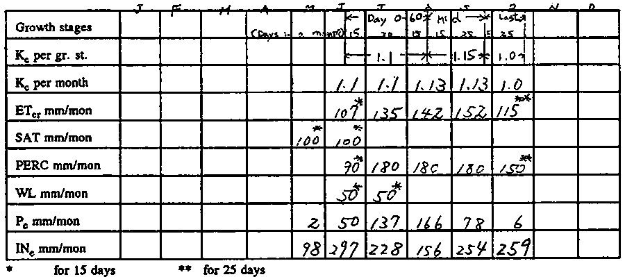 In the same way as for other crops, one has to calculate the INnet rice of the earliest and the latest plantings to find the irrigation requirement for a rice crop with a staggered cultivation. The irrigation needs of a second crop after rice during the dry season, beans for instance, are determined as explained in Section 3.4.1.