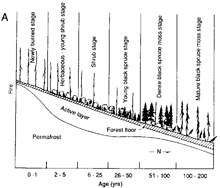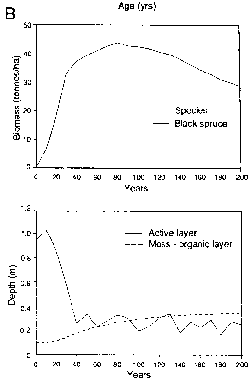 As an example, Fig. 3 illustrates one of the testing protocols for Bonan's model of forest structure and succession for North American boreal forests. Bonan (1989) and Bonan and Korzukin ( 1989) simulated forest succession and permafrost dynamics of naturally regenerated forests on both north-facing and south-facing slopes under environmental conditions appropriate to Fairbanks, Alaska. Fairbanks is in the "zone of discontinuous permafrost". This region features permafrost formations and successions with black spruce (Picea mariana) on north-facing slopes, and a more complex birch (Betula spp.), aspen (Populus spp.) and white spruce (Picea glauca) succession on permafrost-free south-facing slopes (Bonan and Shugart, 1989). The model was tested for its ability to reproduce the landscape pattern, the composition and structure of specific stands of different ages on different slopes as well as the presence, absence and depth of permafrost under diverse conditions (Fig. 3). Bonan also inspected the ability of the model to reproduce stand structure in a widely dispersed set of locations throughout North America (Bonan, Shugan and Urban, 1990; see also Pastor and Post, 1988).