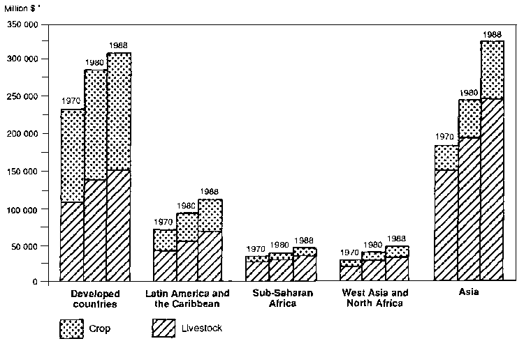 Demonstrating the economic importance of animal agriculture, particularly in developed regions, is not difficult (Fig. 1). Livestock products, such as meat, milk, eggs and hides, account for more than one-half of the value of total agricultural production, including tobacco and other non-food crops (USDA, 1990). In most developing regions, the proportional value of livestock products is lower but still appreciable. As a proportion of total agricultural production, livestock products amount to about 22 percent for Southeast Asia, 25 percent for sub-Saharan Africa (not including the Republic of South Africa), 26 percent for China, 31 percent for West Asia and North Africa and 38 percent for South America.
