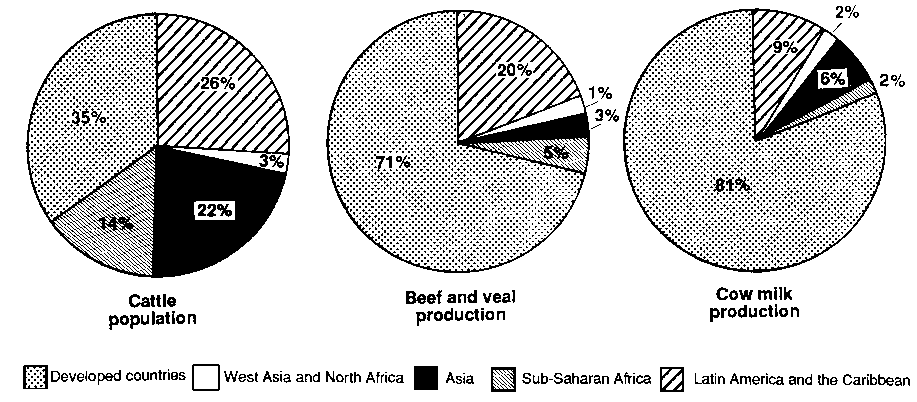One-third of the world's cattle, which are found in developed regions, currently produce 70 and 80 percent of the global beef and milk supplies, respectively. These impressive differences in meat and milk production primarily result from the greater productivity of cattle per head in developed regions. The average yield per cow milked in developed regions is 3 605 kg compared with only 820 kg in developing regions (FAO, 1990). Similarly, the annual beef offtake per head of inventory in developed regions is about double that in developing countries - 35 kg compared with 18 kg.