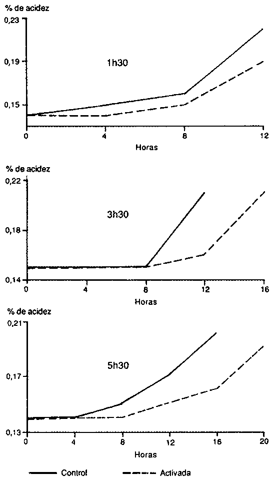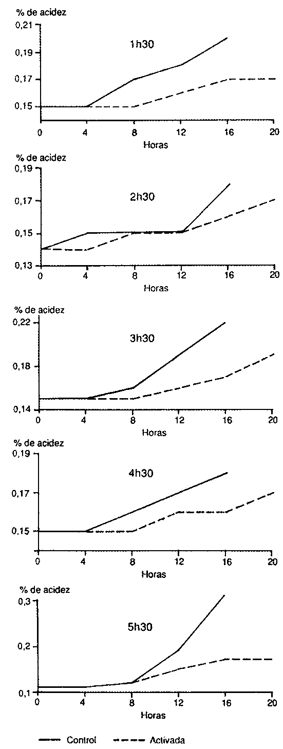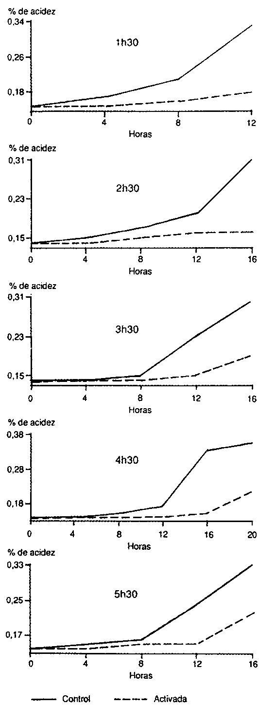 El promedio de las activaciones efectuadas en las vaquerías (Cuadro 4) indica un mayor deterioro del control en relación con la leche activada, ya que las muestras se mantuvieron a temperatura ambiente hasta su análisis en laboratorio. No se observaron diferencias significativas en la acidez del yogurt de la leche tratada y sin tratar.