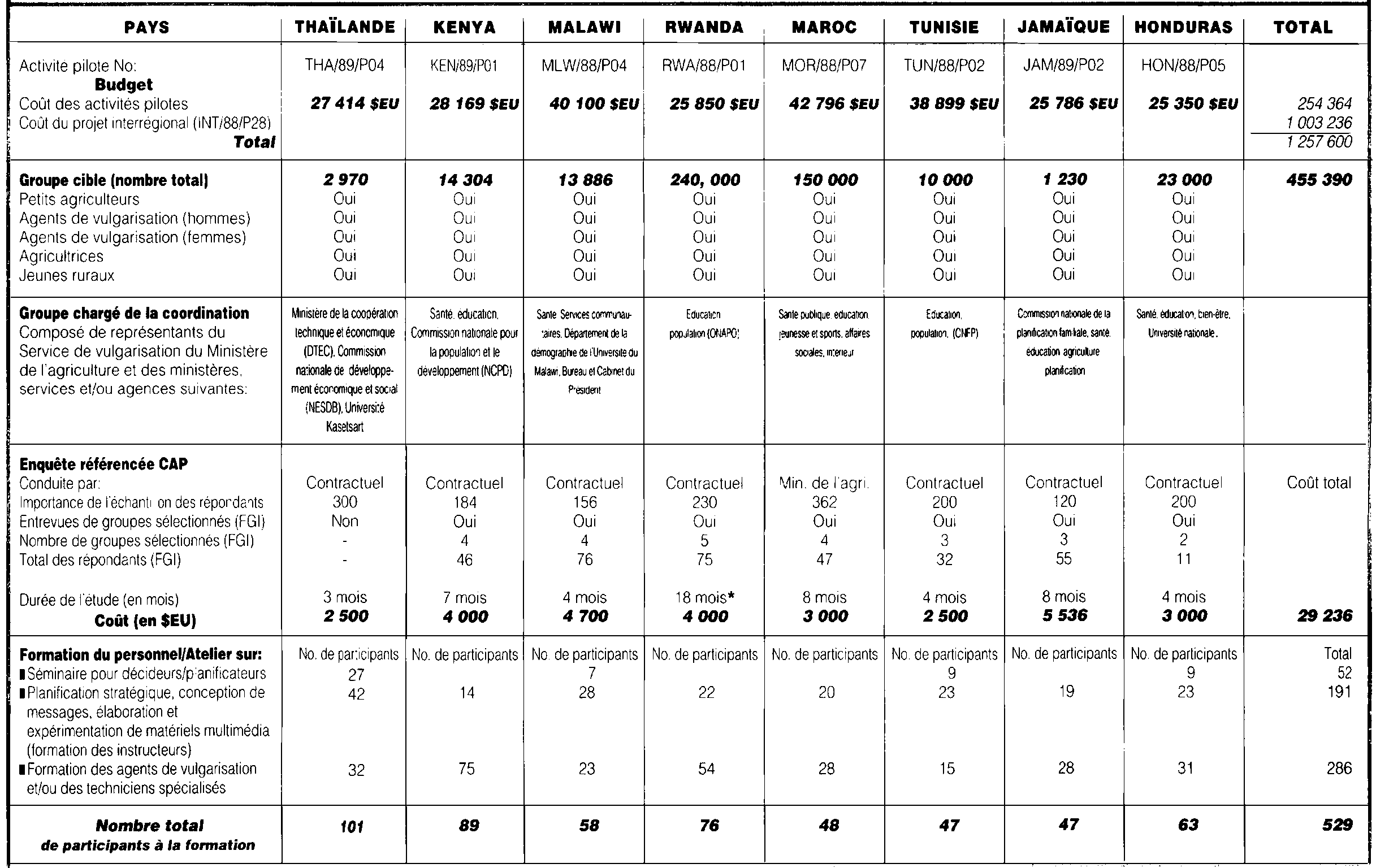 Le projet a été clôturé en décembre 1991 après avoir mené à leur terme les activités pilotes prévues dans huit pays: Honduras, Jamaïque, Kenya, Malawi, Maroc, Tunisie, Rwanda et Thaïlande. D'importantes activités axées sur les résultats et basées sur un processus opérationnel PEDAEX adoptant un cadre conceptuel de CIV furent entreprises dans les huit pays. Ces activités comprenaient, entre autres, un atelier d'élaboration de la planification et de la stratégie PEDAEX, des enquêtes référencées de connaissances, d'attitudes et pratiques (CAP), la création de groupes d'intervention/comités directeurs PEDAEX, des ateliers sur la planification stratégique PEDAEX, la conception de messages et l'élaboration de matériels multimédia, la formation d'agents de vulgarisation à l'utilisation de matériel de soutien de la vulgarisation/formation spécialement conçu à l'intention du PEDAEX et la gestion de l'application du PEDAEX sur le terrain. En outre, des études visant à évaluer le processus ainsi que les résultats obtenus par les activités PEDAEX furent menées dans les huit pays intéressés. Les résultats des évaluations ainsi que les enseignements tirés des expériences du PEDAEX donnèrent lieu à un atelier international sur le thème «Mise en commun de l'expérience et démonstration des résultats du PEDAEX» qui s'est tenu à Meknès, au Maroc, en novembre 1991. On trouvera, à la figure 4-47, une synthèse des principales activités.
