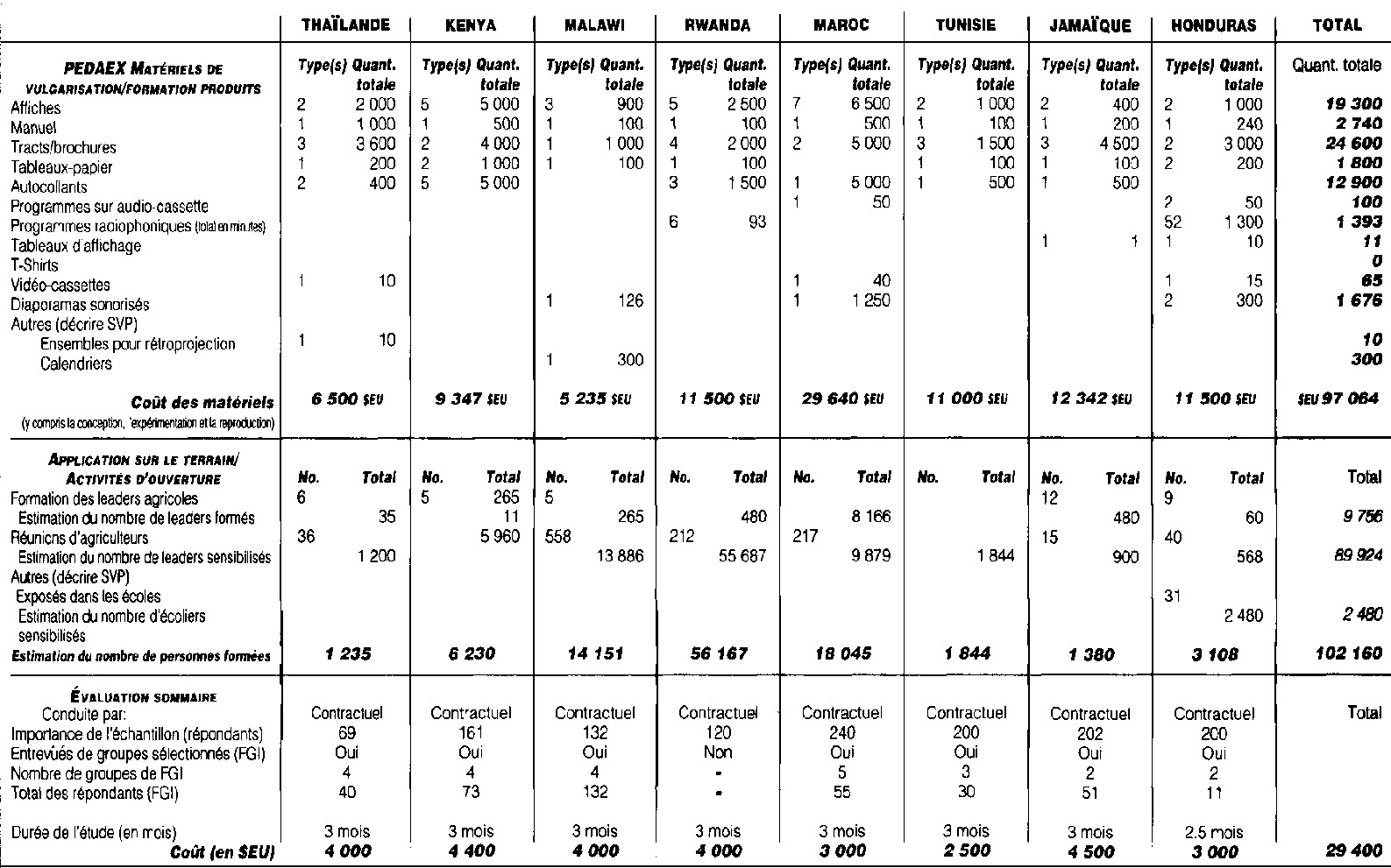 · Expérimentation, révision et reproduction, dans huit pays, de différents prototypes de matériels de soutien de la vulgarisation/formation spécifiquement conçus pour le PEDAEX.