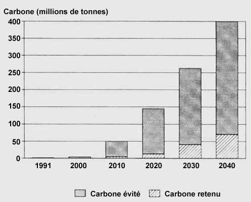 En l'an 2040, ces arbres auraient piégé 85 millions de tonnes de carbone et permis d'empêcher la production de 315 autres millions de tonnes de carbone, soit un rapport de 4 à 1 entre le carbone évité et le carbone piégé. Les 400 millions de tonnes au total de carbone piégé et évité constituent une estimation très généreuse car on présume que les 100 millions d'arbres survivront pendant toute la période de 50 ans et on n'a pas calculé le CO2 qui finira par être émis dans l'atmosphère lorsqu'il faudra enlever des arbres. Même ainsi, cette estimation représente moins de 1 pour cent de la quantité des émissions de carbone prévue aux Etats-Unis au cours de la même période de 50 ans (Nowak, sous presse).