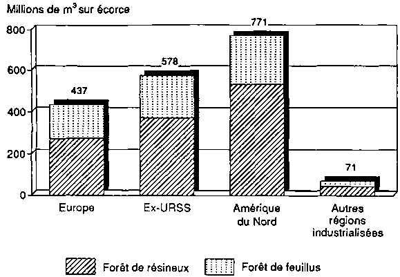 La plus grande concentration de forêts et autres terres boisées se trouve dans les pays qui constituent l'ex-URSS (942 millions d'ha); viennent ensuite l'Amérique du Nord (749 millions d'ha), l'Europe (195 millions d'ha) et les autres régions industrialisées (178 millions d'ha).