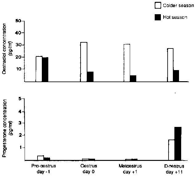 Over several millennia, the buffalo has maintained a fine natural conformity with the annual climatic cycles of temperature, humidity, rainfall, sunshine, solar radiation, etc., which in turn induce the annual vegetation cycle, whether natural or cultivated. This indirect effect of climate (the vegetation pattern) seems to be the most influential in the buffalo's natural reproductive-productive pattern. The water buffalo's natural conformity has been reported in several geographical regions, including China, the Philippines, Thailand, Malaysia, Indonesia, India, Pakistan, Iraq and Egypt. Misra and Sengupta (1965) stated that, in India, the buffalo's sexual vigour declines during summer and improves- with the onset of the colder season. In Egypt, its reproductive behaviour, in particular oestrus, is feeble during the hot season. A herd of buffaloes had almost equal incidences of ovulation in the hot (May-October) and the colder (November-April) seasons. The observed cases of oestrus, however, were more frequent and stronger in the colder season, accompanied by changes in the seasonal pattern of sex hormones (Figure 1) (Shafie et al., 1982; Barkawi, Mokhless and Bedeir, 1989). The number and amplitude of the luteinizing hormone (LH) pulse-e were greater in the colder season (Aboul-Ela and Barkawi, 1988).