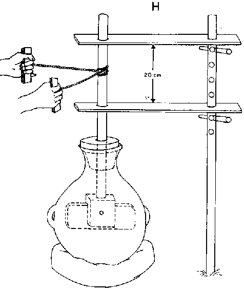 · Nylon rope and handles (G). Nylon rope is inserted through a hole in the upper part of the internal agitator. About half of the rope is wound around the agitator and the ends are attached to wooden handles that, when pulled, give the agitator a circular motion. This rapid circulation causes the paddle blades to rotate in a horizontal position.