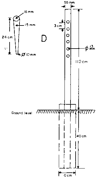· Wooden pole and pegs (D). The wooden pole is made from a single piece of wood. The base of the pole is placed in the ground. In the upper part of the pole there are a number of holes through which the wooden pegs are inserted to keep the braces (E) in place.