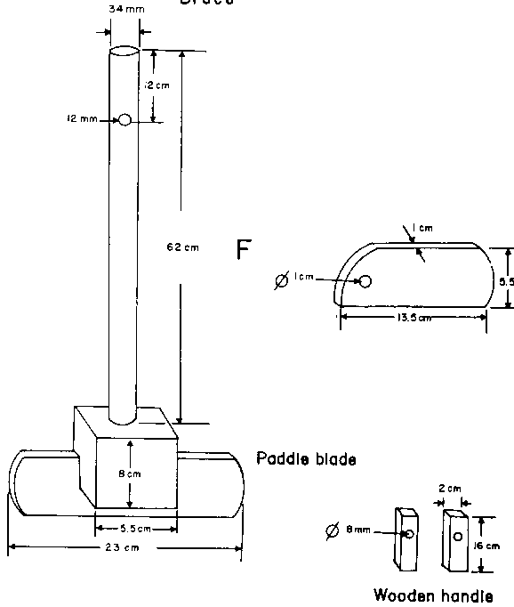 · Internal agitator with paddle blades (F). The base of the agitator is grooved or U-shaped to hold the paddle blades. There are two paddle blades, and these are kept in position by means of a wooden plug (dowel) inserted at the base of the agitator. When the agitator is not in use the paddle blades hang vertically, thus enabling the agitator to be inserted into the clay pot.
