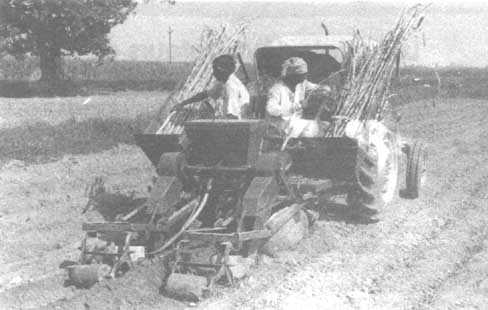 The IISR two-row cutter-planter, mounted on a 35-horsepower tractor, consists of furrow-opening tillage discs and sub-units that perform sett cutting, fertilizing and chemical dispensing, soil covering and pressing operations in a single pass of the tractor.