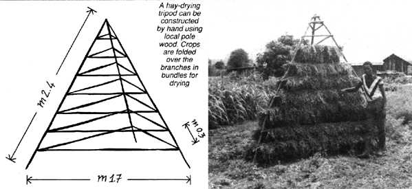 Traditional, hand-hewn hay tripods, long used by European smallholders as a cheap and relatively easy way to dry a hay crop for storage, can be useful in developing countries, where population pressure is forcing a switch from pasture grazing to the kind of zero-graze livestock systems that put a premium on intensive fodder-making.
