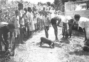 In Europe, outbreaks of African swine fever are controlled by isolating and | slaughtering infected herds, but the USDA decided it was necessary to slaughter every pig on the island to be sure the virus was gone. The impact was enormous. Pigs in Hispaniola, as in many developing countries, are a "bank" for the poorest farmers. They eat scraps and turn them into meat. They produce piglets the farmers can sell to pay school fees or raise money for a wedding. And in Haiti, the sacrifice of a black pig is central to the Vaudou religion.