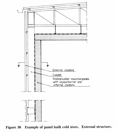 A cold store can be built as an ordinary building using conventional building material, such as bricks, concrete or concrete process sections to which a vapour barrier and insulation is fitted internally. Modern insulation material, in particular polyurethane, has a strength that can be utilised structurally. Today, this is used for panel designs suitable for all sizes of cold rooms from (20m 3 to 250 000m 3) . Factory made insulation panels are delivered to the site complete with a vapour barrier and internal cladding, thus reducing the site work to a minimum. There are two basic principles for panel-built cold stores. A common system has an external structure and cladding with a wall insulation on the inside of the columns and the insulated ceiling hanging from the outer roof structure as shown in Figure 30.