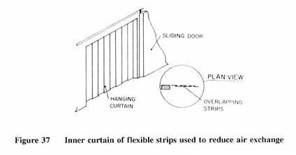 Store door openings can be fitted with an inner curtain made from overlapping strips of synthetic material suitable for use at low temperatures (Figure 37). This reduces the air exchange considerably without interfering too much with traffic but the curtain must be maintained in good order and, as with the air curtain, not abused by leaving the outer main door open.