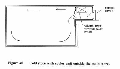 Stores with unit coolers. The most widely used method of cooling modern cold stores is by means of unit coolers with fan designed with good air flow characteristics (or good circulation of the air). This type of cooler is generally the cheapest to install; it contains a relatively small charge of refrigerant, it can be readily defrosted without interfering too much with the store conditions and it does not require a heavy structure for support. The main disadvantage is that many designs using this type of cooling unit do not allow for uniform distribution of the air within the store. This gives rise to poor storage conditions where the air circulation is either too high or too low (Figure 38). By suspending the unit cooler from the ceiling (Figure 39) or installing the unit outside the store (Figure 40) and ensuring that pallets are stacked with suitable head space and floor spacing, uniform air distribution can be achieved.