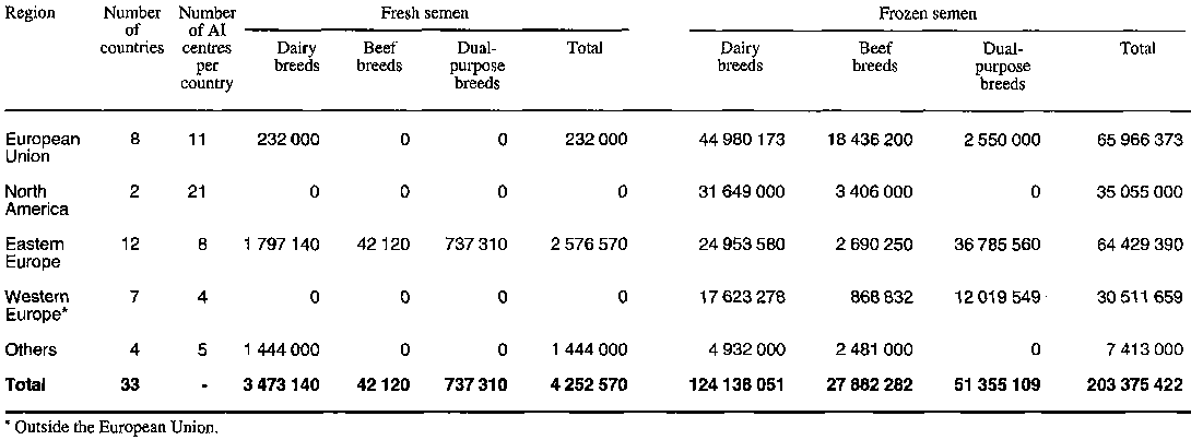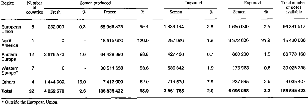 In general terms, the 32 developed countries included in this section of the analysis export more semen than they import. This means that more than 1.5 million doses from dairy breeds, 400 000 doses from beef breeds and 500 000 doses from dual-purpose breeds are exported to other regions in the world. Even though the United States did not provide information on the importation of semen, it can be assumed that most of this surplus goes to developing countries or to countries in the former USSR. The results of the first survey showed that developing countries imported more than 3 million doses in 1991 (Chupin and Schuh, 1993).