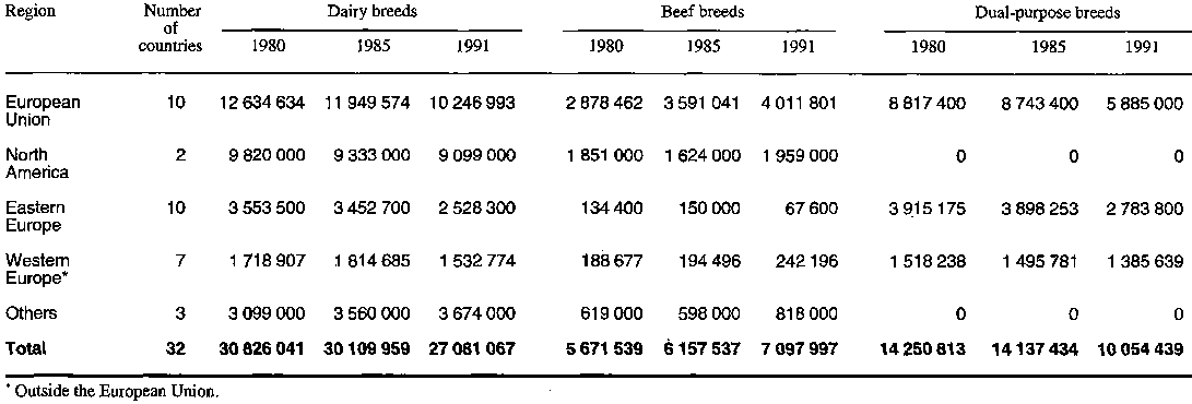 The distribution of breeds under dairy, beef and dual-purpose was not always clearly defined and varied between countries. For example, Germany and Norway grouped all of their dairy animals under dual-purpose, while France, Portugal, South Africa and Australia, among others, included dual-purpose animals with dairy or beef breeds. Nevertheless, the three distinct categories of females have been kept for the purpose of the analysis. As regards Spain, Macedonia, Poland, Finland and Switzerland, the number of breedable females, which they failed to indicate in the questionnaires, has been estimated by multiplying the number of head of cattle quoted in the FAO statistics (FAO, 1992) by a 0.45 coefficient.