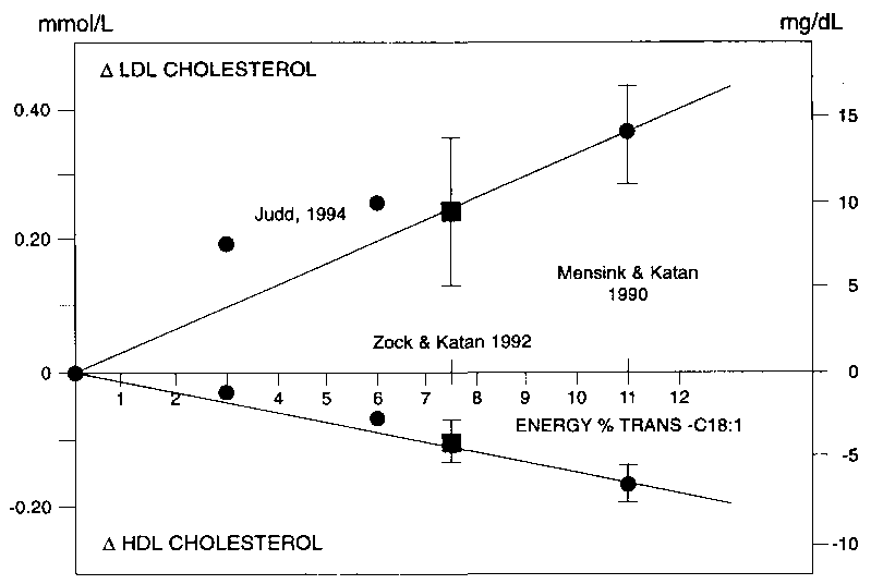 A study in the USA compared saturated fatty acids, oleic acid and two levels (3.8 and 6.6 en %) of trans isomers (Judd et al., 1994). All diets contained at least 10 en % of the saturated fatty acids, lauric, myristic and palmitic acids and 3 en % stearic acid. Linoleic acid was maintained at 6 en % of the diet. The tightly controlled experiment demonstrated differences in the effects of cis and trans monounsaturated fatty acids, even when they constituted less than 4 en %. After 6 weeks on the test diets, the "moderate trans", "high trans" and saturated diets raised cholesterol levels. In agreement with the results of Mensink and Katan (1990), a diet containing trans fatty acids raised LDL-cholesterol and apoprotein b and depressed HDL-cholesterol and to a lesser extent apoprotein A- 1, compared to the oleic diet. Statistically significant changes at a lower level of intake were observed since the saturated diet increased both the LDL-cholesterol and the HDL-cholesterol. The ratio of LDL-to HDL-cholesterol was less favourable with the 6.6 en % trans diet than with the saturated diet. The diet containing 6.6 en % of trans fatty acids, compared to the other diets studied, also elevated blood triacylglycerol. Although the overall changes were small, the trans fatty acids and the saturated fatty acids had somewhat similar effects.
