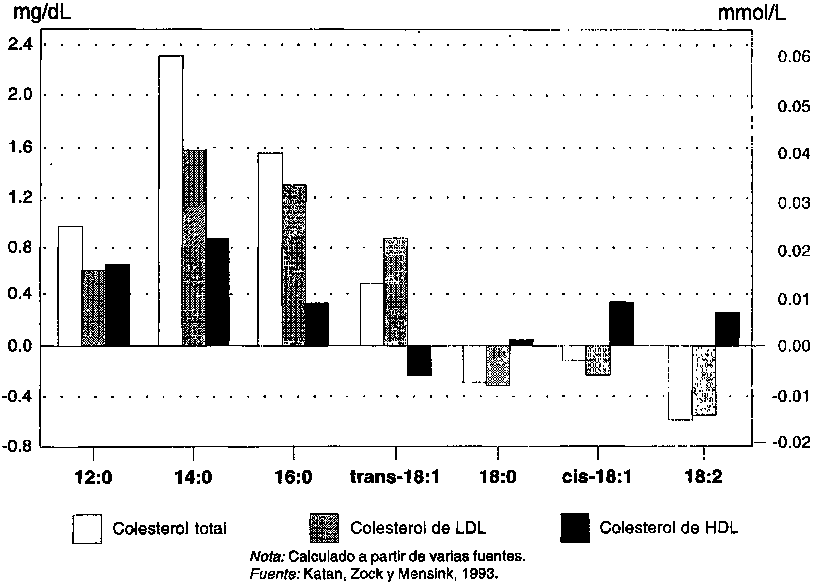 Muchos estudios han demostrado que la cantidad y composición de las grasas de la alimentación son los principales determinantes de los niveles de colesterol de LDL del suero. Se ha concluido que, con respecto a los carbohidratos, los ácidos grasos saturados elevan el nivel de colesterol del suero, mientras que los ácidos grasos poliinsaturados (ácido linoleico) lo bajan, y los ácidos grasos monoinsaturados (ácido oleico) no presentan efectos estadísticamente significativos (Keys, Anderson y Grande, 1957; Hegsted et al., 1965). Si bien algunos estudios realizados en los últimos 30 años han obtenido resultados diversos, en conjunto los datos actuales (Hegsted et al., 1993) confirman estas conclusiones generales respecto a los efectos relativos de los ácidos grasos saturados, poliinsaturados y monoinsaturados en los niveles de colesterol del suero. La capacidad específica de los ácidos grasos saturados y poliinsaturados de modificar los niveles lipidícos del suero no se ha definido claramente en todas las condiciones, y probablemente no sea posible hacerlo. Al principio, Keys y sus colaboradores (1957) pensaron que la capacidad de elevar el nivel de colesterol en el suero de una combinación de ácidos grasos saturados era el doble de la de los ácidos grasos poliinsaturados de bajarlo; estudios posteriores realizados por Hegsted (1965) han atribuido mayor capacidad a los poliinsaturados. Sin embargo, estudios individuales realizados con pocas personas y regímenes alimentarios pueden mostrar importantes diferencias en los efectos observados. Los análisis combinados (Mensink y Katan, 1992; Hegsted et al., 1993) concuerdan en que el efecto del ácido linoleico para bajar el nivel de colesterol es de 2 a 3 veces menor que el de los ácidos saturados para subirlo. No obstante, indican importantes diferencias en cuanto a la capacidad relativa según los datos elegidos para el análisis. Es incierto si esto se debe a las características de los individuos, de la alimentación o a las grasas estudiadas, la calidad de los estudios, etc. Está claro que el contenido de grasa de la alimentación y su composición son los principales determinantes de los niveles de colesterol en el suero; que los ácidos grasos saturados y el colesterol de la alimentación elevan el colesterol sérico, y que los ácidos grasos poliinsaturados (ácido linoleico) presentan un moderado efecto reductor del nivel de colesterol con respecto a los hidratos de carbono.