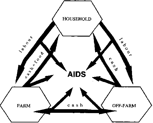 HIV/AIDS intervenes and affects these different sub-systems and their interlinkages as demonstrated in Figure 5. Cash and labour flows are partly diverted to AIDS leaving less labour for farm and off-farm activities as well as reducing cash for the household. Cash which is exchanged by the farm and off-farm system for the purpose of, for example, purchasing fertilizer or financing investments in off-farm activities, may also be used for AIDS related expenses.