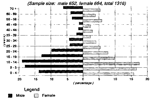 In Uganda's Gwanda community, it is suspected that HIV/AIDS had a marked impact on the age pyramid shown in Figure 6. The 20 to 49 year age group is particularly under-represented as well as the very young, children between the ages of 0 and 4, in comparison to the national age pyramid.