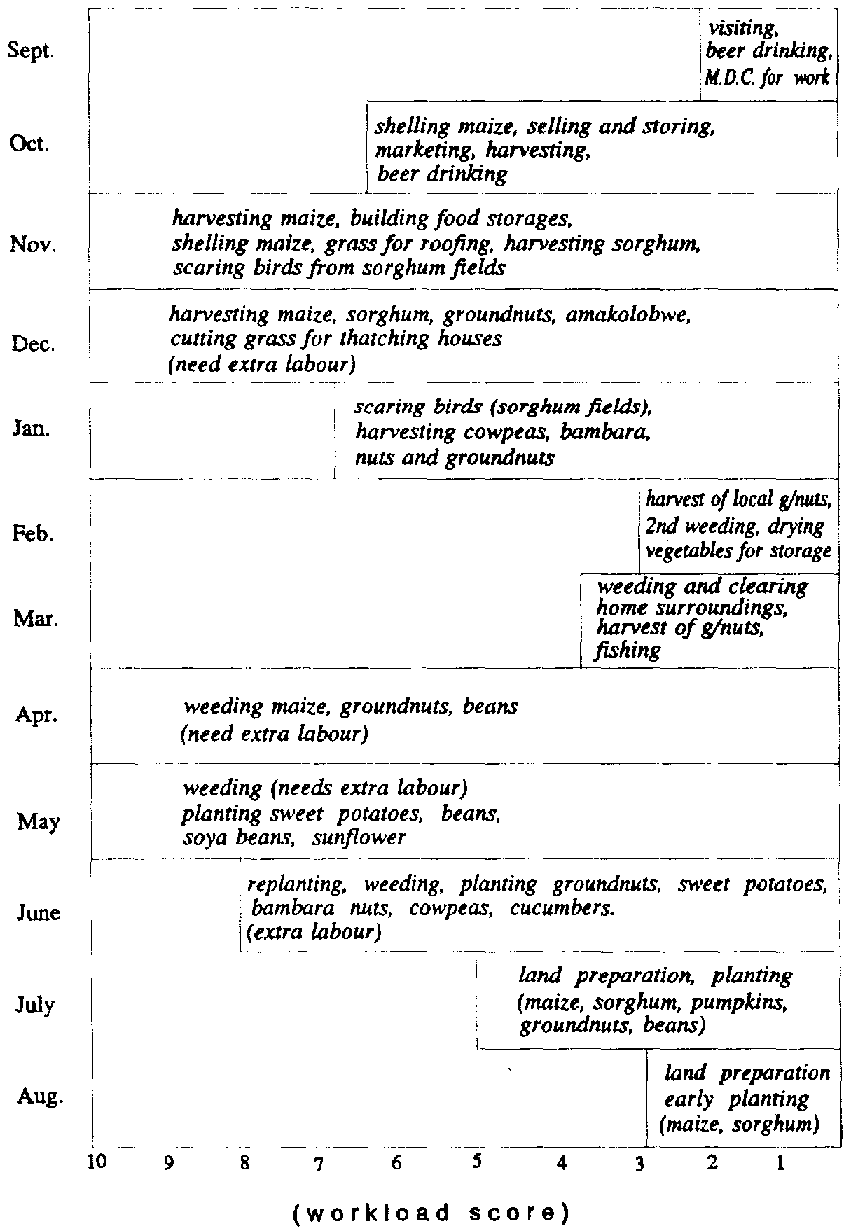 Agricultural labour requirements seem to be more equally distributed over the year in the Ugandan study areas than in the communities examined in Zambia. This can be attributed to the fact that large parts of Uganda are characterized by a bimodal rainfall pattern and a wide range of crops are cultivated, while there is only one rainy season in Zambia and the predominant farming system is maize-based. Figure 7 shows labour distribution for women in Zambia with two marked labour peaks in the year.