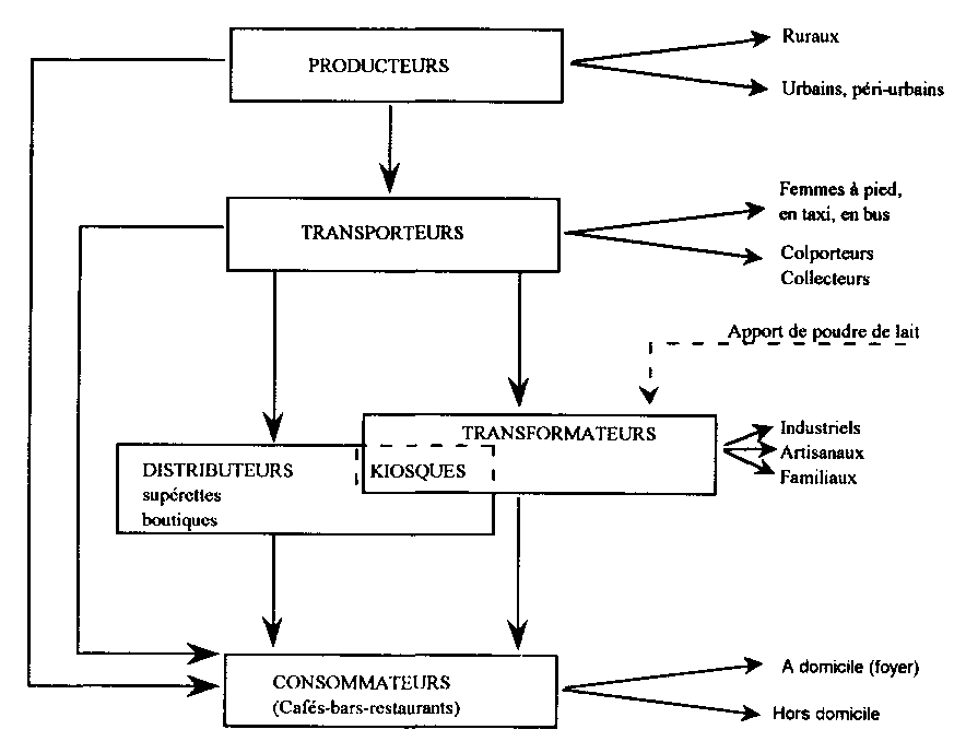 Au delà d'une certaine distance le transport se réalisera en taxi ou bus ou le lait sera confié, à partir d'un point de rencontre, à une autre femme ou - le plus souvent - à un collecteur-colporteur. Ce dernier se chargera d approvisionner, en vélo ou en mobylette. un point de distribution (marché, boutiques, kiosques). Il pourra également assurer lui-même cette distribution auprès d une clientèle d'abonnés: simples particuliers, restaurants' cafés-bars etc.