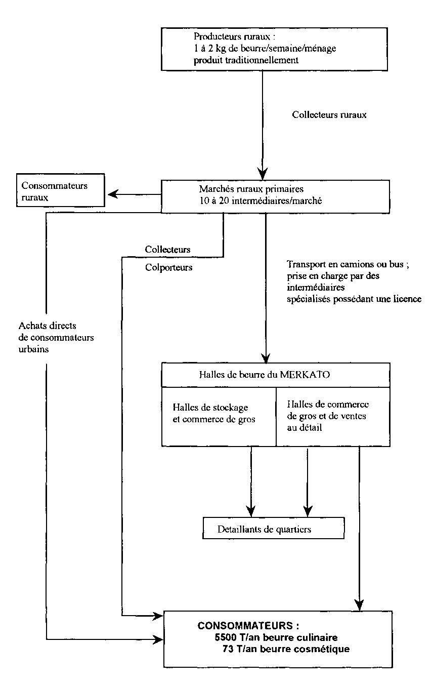 Le beurre est fabriqué par les producteurs ruraux à raison de 1 ou 2 kg par semaine et par ménage; ce beurre est regroupé par des collecteurs ruraux et rassemblés au niveau de marchés primaires situés le long des axes routiers jusqu'à 170 km de la capitale. A ce niveau règne une vive concurrence: une partie du beurre est vendue directement pour les consommateurs locaux ou à des consommateurs venus de la ville, alors que des colporteurs se portent acquéreurs de petites quantités qu'ils acheminent directement vers la ville et vendent à une clientèle connue et fidélisée (particuliers, kiosques, restaurants...). Mais la plus grosse partie du beurre présent sur les marchés ruraux est regroupée et transportée (bus ou camions) en bloc de 50 à 100 kg par des intermédiaires agréés (licence nécessaire).