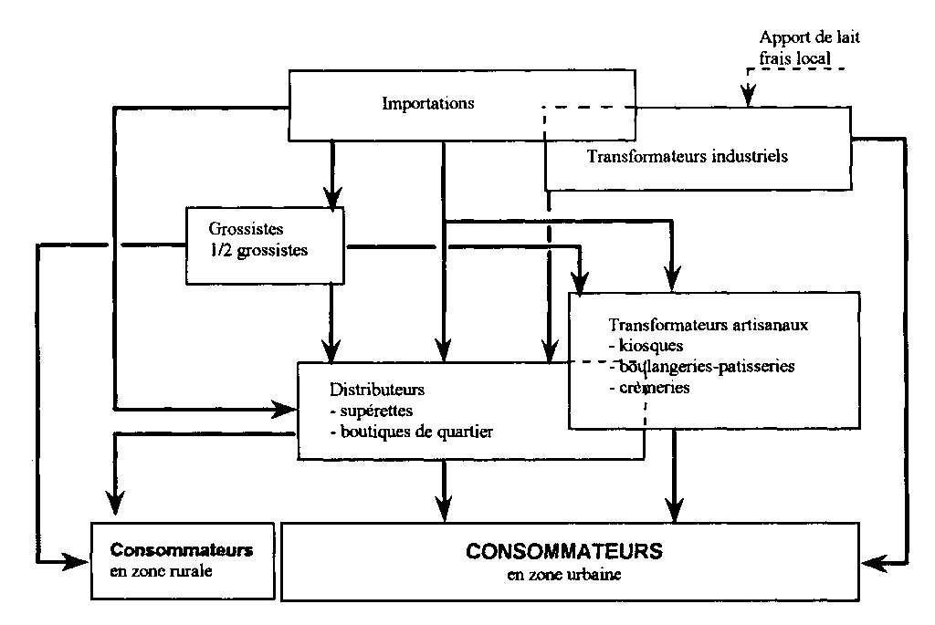 L'offre commerciale de lait par les producteurs africains reste souvent marginale ou faible tant au regard de la production des troupeaux que par rapport aux produits importés. Seule la proximité d'un centre urbain de quelque importance va dynamiser cette offre grâce à la présence d'une demande solvable émanant principalement des couches aisées locales très attirées également par les produits d'importation jugés de meilleure qualité et moins chers. Quelle que soit l'origine des produits, les systèmes de distribution mis en place pour les diffuser vont s'avérer complexes et relativement efficaces. Ils mettent en jeu de nombreux intermédiaires dont les marges demeurent modestes pour ne pas pénaliser ni décourager et les producteurs et les consommateurs. Une partie de la filière s'inscrit dans le contexte d'économie informelle qui caractérise bon nombre d'activités en Afrique. Caractérisés par une forte atomisation, ces circuits de distribution font preuve néanmoins d'une grande flexibilité, ce qui permet une diffusion très fine des produits dès l'instant où se manifeste une demande. Répondant à des besoins similaires, dans des milieux confrontés aux mêmes contraintes économiques, sociologiques, climatiques..., ils présentent une grande analogie d'un pays à l'autre.