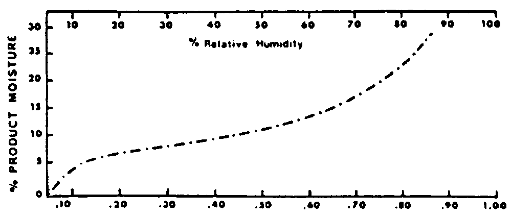 Thus, this food, at the temperature for which this absorption isotherm was established, will ultimately attain a moisture content of 20% at 75% RH (relative humidity). If this food was previously dehydrated to below 20% moisture and placed in an atmosphere of 75% RH, it would absorb moisture until it reached 20%. Conversely, if this food was moistened to greater than 20% water and then placed at 75% RH, it would lose moisture until it reached the equilibrium value of 20%.