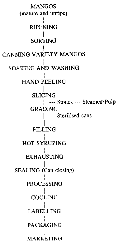 Sound ripe mangos are soaked in antiseptic and water, brush washed and then conveyed to the preparation tables and hand peeled. "Cheeks" of the peeled mangos are sliced off and longitudinally cut into two or three slices. Side cuts are packed separately. Slices are then conveyed to the filling tables where they are graded for size, colour and maturity and filled into sterile cans. Filled cans are syruped, steam exhausted, sealed, processed in boiling water, cooled, labelled and packaged.