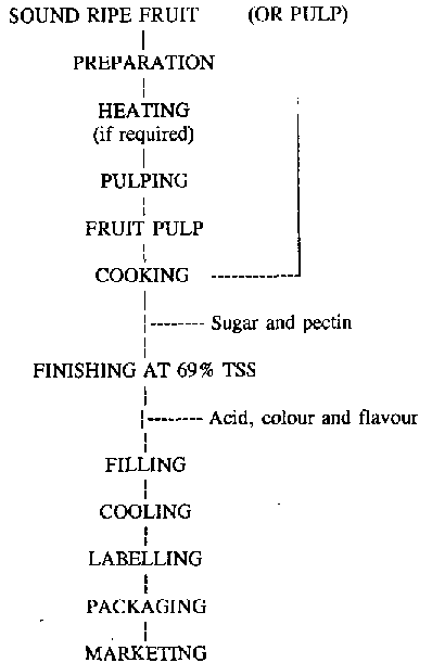 Fruit pulp is cooked with the requisite quantities of sugar and pectin, and finished to 69% Total Soluble Solids (TSS). Permitted food colours and the requisite amounts of citric acid and flavouring are added at this stage. The product is packed in cans or glass jars, and cooled, followed by labelling and packaging.