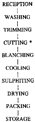 The raw material is washed thoroughly and broken up. Cores and interlocular partitions are removed by hand. Defective parts are cut out with knives. The prepared flesh is held under water or a weak solution of sodium metabisulphite (2000 ppm SO2) before being hand cut into strips about 5 mm wide.
