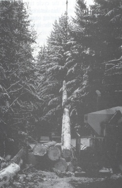 However, group felling and other small-scale harvesting cuts require a high forest road density due to their proportionally small harvesting volume per area so that otherwise useful logging and processing equipment become unprofitable; this is because installation time is excessive in proportion to time of operation. The construction crane with comparatively short time needed for setting up can be an alternative method in certain situations so as to ensure the advantages of cable logging - in particular the "lifted load" avoids excessive damage to young trees of the natural regeneration; furthermore it avoids soil compaction and wounding of the ground, which may frequently be the initial stage of soil erosion. These advantages are not lost during the processing phase because the wood processor is also set up on the forest road. Logging by construction crane might be an alternative, as well, if the terrain is inaccessible because of wet soil, slope gradient or obstacles, such as boulders, covering the ground.
