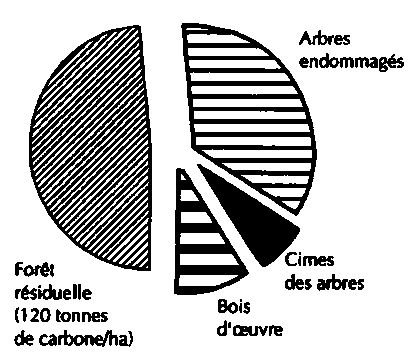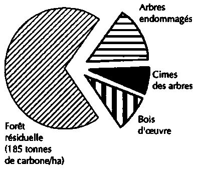 Une étude réalisée dans les forêts à Dipterocarpacées au Sabah, en Malaisie, fournit un exemple des avantages des techniques de récolte améliorées (Pinard, 1994). Normalement, les arbres de plus de 60 cm de diamètre à hauteur de poitrine sont récoltés et traînés jusqu'aux premiers dépôts transitoires par des bulldozers. Environ 8 à 15 arbres par ha sont prélevés de cette manière et jusqu'à 75% des arbres résiduels souffrent de dégâts dûs à la coupe. Avant d'être exploitées, ces forêts peuvent stocker jusqu'à 330 tC/ha. L'opération de récolte prélève à peu près 80 tC/ha. Grâce à des techniques de récolte contrôlées, il a été démontré que si les dommages au peuplement résiduel pouvaient être réduits de 40 à 20%, la quantité supplémentaire de carbone subsistant dans la forêt résiduelle après 10 ans pourrait dépasser 65 tonnes/ha (Fig. 8.3).