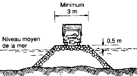 La figure 44 montre un appontement simple aménagé dans une zone à marée. La partie pleine du débarcadère ne doit pas aller au-delà des obstacles naturels présents, en l'occurrence un affleureument rocheux.