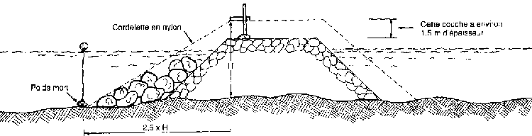 On peut empêcher la diffusion en mer des matériaux de remblaiement en interposant des filtres en géotextile d'une porosité adéquate (figure 43c). Le filtre en géotextile doit être maintenu en place sur le talus du remblai au moyen de lourdes pierres (et non de piquets), qui peuvent être ensuite incorporées dans l'enrochement de retenue du remblai. Cet enrochement consiste en quartiers de roche d'au moins 500 kg disposés avec soin.