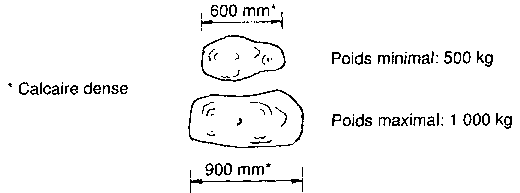 Première sous-couche. La première sous-couche de pierres (figures 32a à 32c) destinée à empêcher le lessivage de la blocaille du cur est généralement constituée de blocs de pierre dont le poids varie de 500 à 1 000 kg ( 1 tonne).